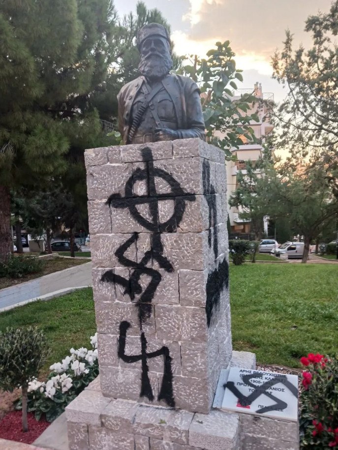 Με ναζιστικά σύμβολα, σβάστικες και στόχους, βεβήλωσαν το μνημείο του Άρη Βελουχιώτη στην Πετρούπολη, όπως καταγγέλλουν ΚΚΕ και Πανελλήνια Ένωση Αγωνιστών Εθνικής Αντίστασης (ΠΕΑΕΑ).