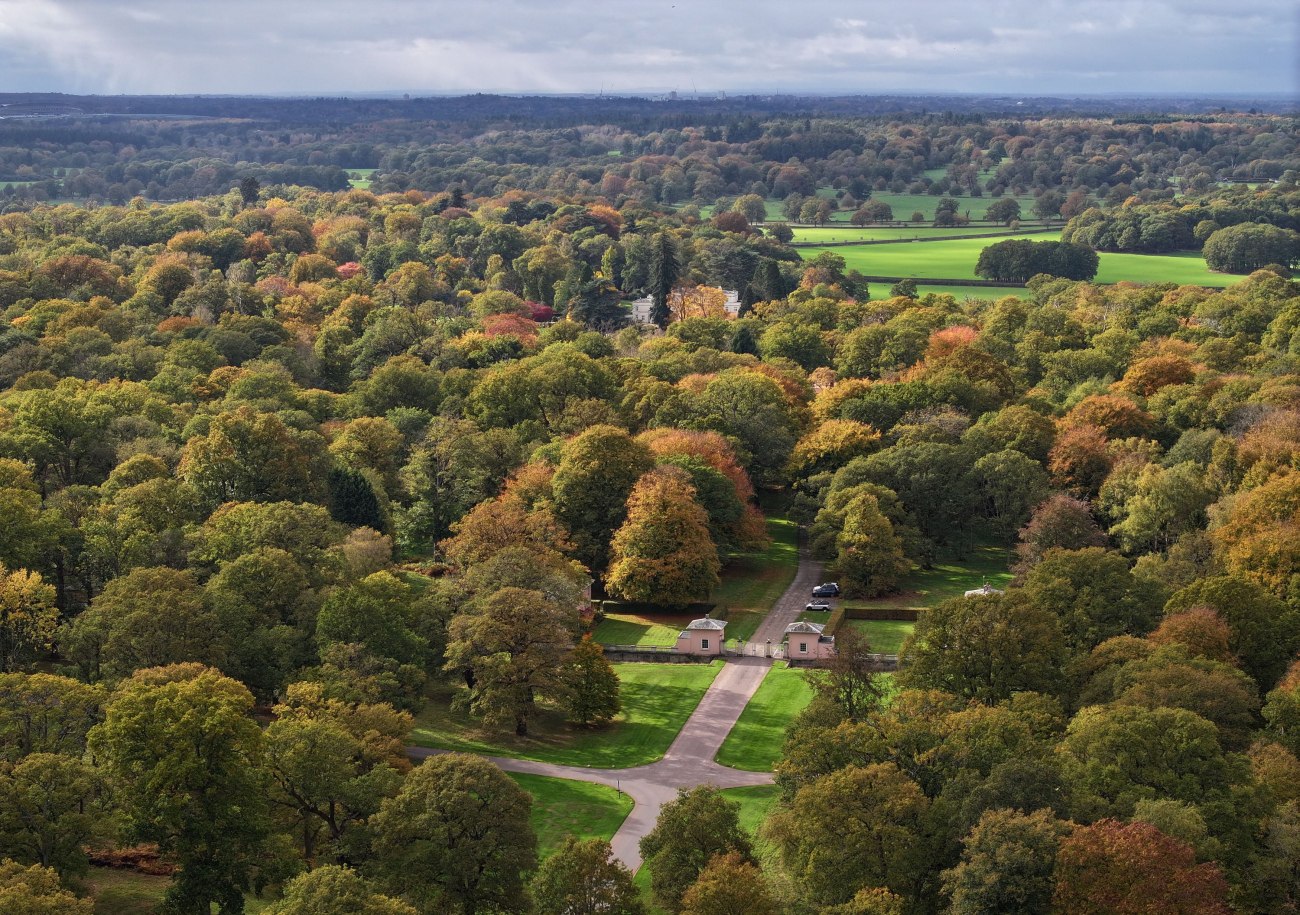 Μια εναέρια λήψη με drone δείχνει την πύλη εισόδου που οδηγεί στο Royal Lodge, μια μεγάλη ιδιοκτησία στην έκταση γύρω από το Κάστρο του Ουίνδσορ, η οποία ανήκει στον Βρετανό πρίγκιπα Άντριου, στο Ουίνδσορ της Βρετανίας, στις 21 Οκτωβρίου 2025. REUTERS/Stringer