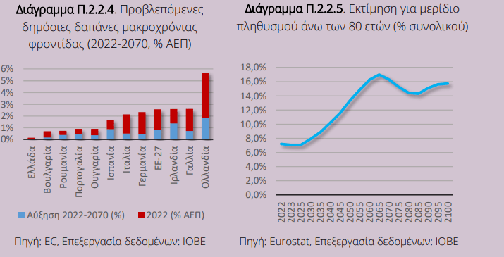 Ωστόσο, πέρα από την ιστορικότητά τους, η μελλοντική τάση των ελληνικών δημοσίων δαπανών για μακροχρόνια φροντίδα διαφαίνεται δυσοίωνη καθώς, σύμφωνα με εκτιμήσεις της ΕΕ προβλέπεται ισχνή (έως και ανύπαρκτη) αύξησή τους μεταξύ 2022 και 2070, ενώ κατά το ίδιο χρονικό διάστημα οι ανάγκες αναμένεται ότι θα πολλαπλασιαστούν, καθώς προβλέπεται ότι το μερίδιο του πληθυσμού άνω των 80 ετών θα διπλασιαστεί, από 8% το 2022 σε 16% το 2070.