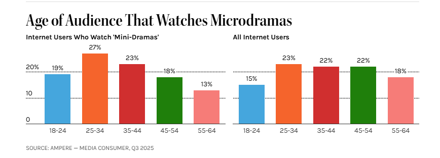 Το πιο «φανατικό» κοινό; Οι ηλικίες 18-34, οι οποίοι έχουν 21% περισσότερες πιθανότητες να δουν mini-dramas σε σχέση με τον μέσο χρήστη. Σχεδόν ένας στους δύο (46%) στην ηλικιακή αυτή ομάδα τα παρακολουθεί.