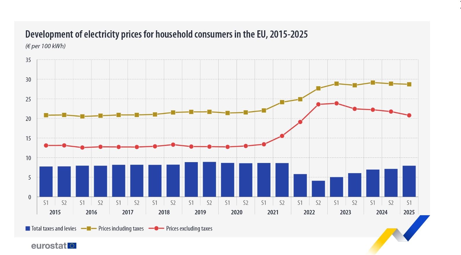 Το μερίδιο των φόρων και των τελών στους λογαριασμούς ηλεκτρικής ενέργειας αυξήθηκε από 24,7 % το δεύτερο εξάμηνο του 2024 σε 27,6 % το πρώτο εξάμηνο του 2025. Ως αποτέλεσμα, η μείωση των τιμών της ηλεκτρικής ενέργειας προ φόρων δεν έχει ακόμη αντικατοπτριστεί στις τελικές τιμές για τους καταναλωτές.