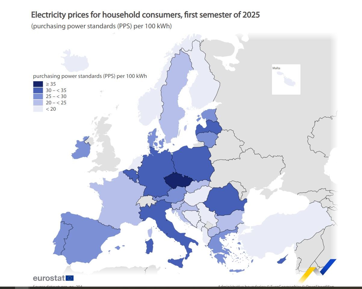Εκφρασμένες σε πρότυπα αγοραστικής δύναμης (Purchasing Power Standards) οι τιμές ηλεκτρικής ενέργειας ήταν οι υψηλότερες για τα νοικοκυριά στην Τσεχία (39,16), την Πολωνία (34,96) και την Ιταλία (34,40). Οι χαμηλότερες τιμές με βάση το PPS παρατηρήθηκαν στη Μάλτα (13,68), την Ουγγαρία (15,01) και τη Φινλανδία (18,70).