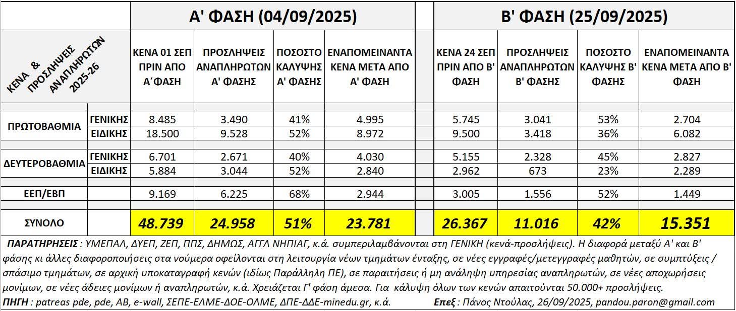 Σύμφωνα με τον Θοδωρή Μακρή, μέλος του Δ.Σ. της Ομοσπονδίας Γονέων Αττικής, αρμόδιο για τον Νότιο Τομέα, ακόμα και μετά τη Β’ φάση προσλήψεων αναπληρωτών, παραμένουν εκατοντάδες κενά στα σχολεία, όλων των βαθμίδων. Οι περισσότερες ελλείψεις αφορούν την παράλληλη στήριξη, με πάνω από το 70% των παιδιών να είναι εκτός.