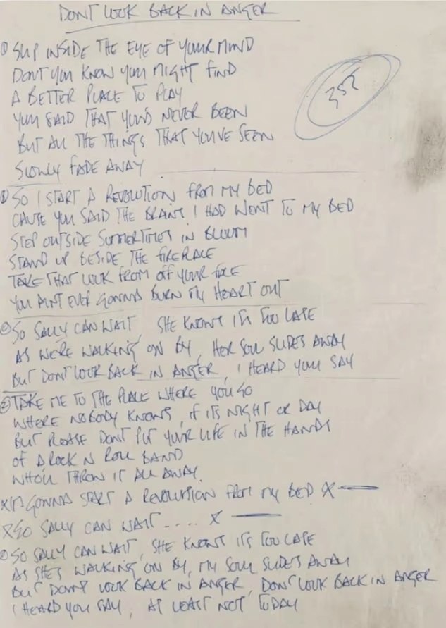 Και τρεις δεκαετίες αργότερα, το Don’t Look Back in Anger συνεχίζει να συγκινεί και να ενθουσιάζει. Πριν από λίγες ημέρες, ο οίκος Propstore Auctions «έβγαλε στο σφυρί» το χαρτί με τους χειρόγραφους στίχους του τραγουδιού – αυτούς που ξεκίνησε να γράφει ο Νόελ στο Παρίσι «ένα βροχερό βράδυ» όπως έχει δηλώσει.