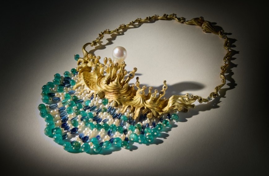 Το αποτέλεσμα ήταν ένα εντυπωσιακό κολιέ – ο χρυσός των 18 καρατίων δημιουργεί ένα κυκλικό δαχτυλίδι που θυμίζει κοραλλιογενείς υφάλους, ενώ είναι «ντυμένο» με διαμάντια, ένα μεγάλο μαργαριτάρι, ζαφείρι και σμαραγδένιες χάντρες.