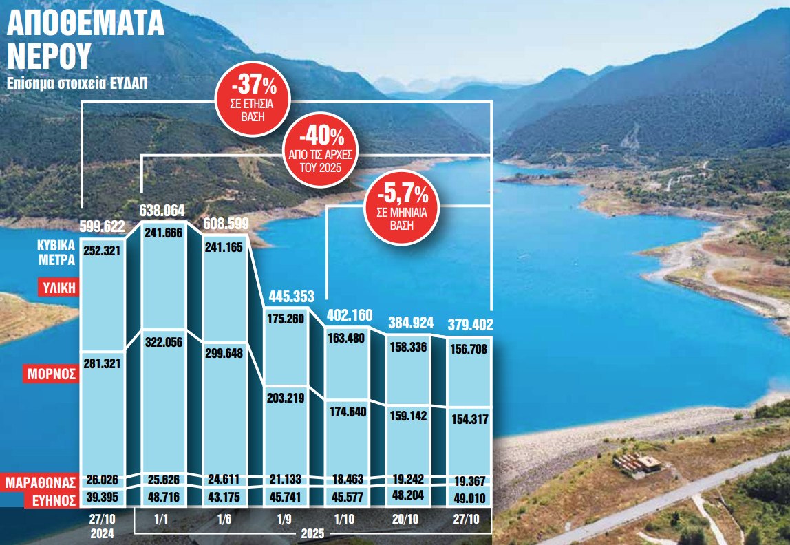 Η Αττική αντιμετωπίζει σοβαρό πρόβλημα λειψυδρίας που οξύνεται διαρκώς, καθώς τα αποθέματα νερού στους ταμιευτήρες βρίσκονται σε ιστορικά χαμηλά επίπεδα. Σύμφωνα με τα στοιχεία της ΕΥΔΑΠ, στις 27 Οκτωβρίου 2025, οι ταμιευτήρες – έγιναν τέσσερις με την προσθήκη του Εύηνου το 2002 – περιείχαν συνολικά λιγότερα από 380 εκατομμύρια κυβικά μέτρα νερού, δηλαδή περίπου το 25% της συνολικής τους χωρητικότητας. Με άλλα λόγια, σχεδόν τα τρία τέταρτα των ταμιευτήρων είναι άδεια, ενώ ο ρυθμός εξάντλησης των αποθεμάτων – 37% το τελευταίο 12μηνο, 5,7% από τις αρχές Οκτωβρίου και 40% από την 1η Ιανουαρίου – έχει σημάνει συναγερμό σε όλα τα επίπεδα: την ΕΥΔΑΠ, την Περιφέρεια και, βεβαίως, την κυβέρνηση, η οποία ετοιμάζεται να ανακοινώσει το επόμενο διάστημα ένα πακέτο μέτρων, πιθανότατα διά στόματος του ίδιου του Πρωθυπουργού.
