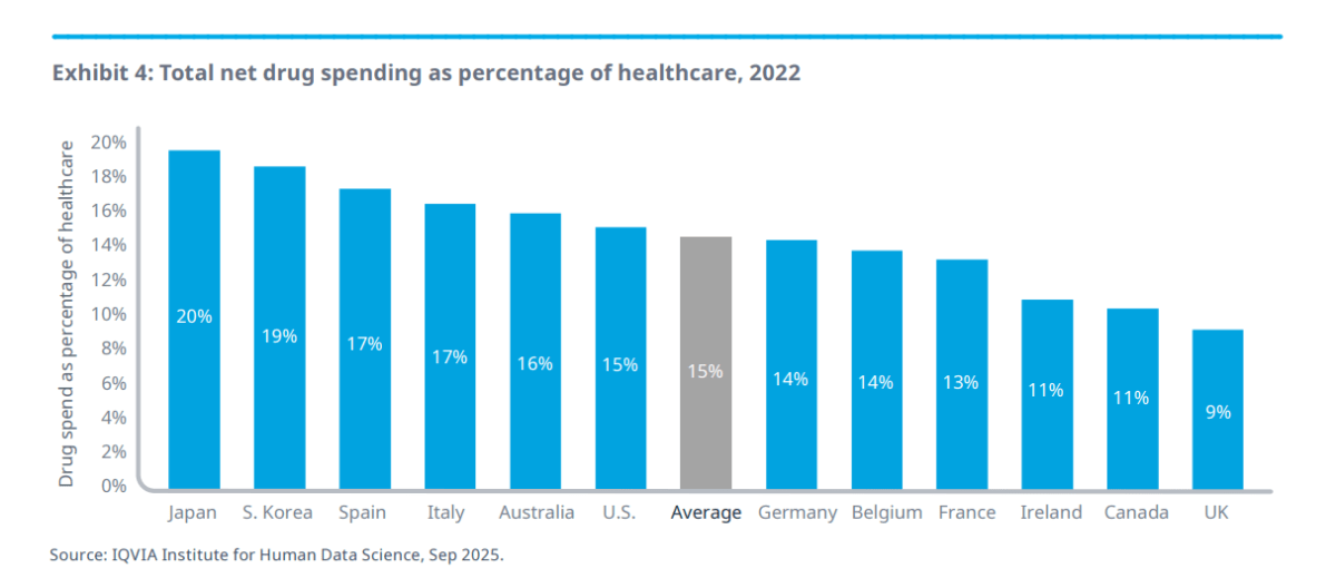 Το χαμηλότερο ποσοστό φαρμακευτικής δαπάνης έχει το Ηνωμένο Βασίλειο, με 9%, ποσοστό που παραμένει σταθερό για πάνω από 20 χρόνια. Στη δεύτερη χαμηλότερη θέση βρίσκονται η Ιρλανδία και ο Καναδάς με ποσοστό 11%, ενώ στα υψηλότερα επίπεδα βρίσκονται η Ιαπωνία και η Νότια Κορέα, με 20% και 19%, αντίστοιχα. Στις υπόλοιπες χώρες οι δαπάνες για φάρμακα, κυμαίνονται μεταξύ 13-17% και οι διακυμάνσεις αυτές σχετίζονται με την έγκριση, διαθεσιμότητα και χρήση νέων φαρμάκων, αλλά και τις διαφορές τιμολόγησης σε κάθε χώρα.