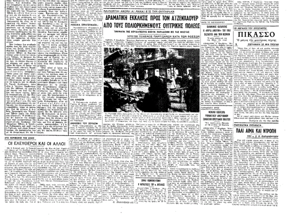 Ελάτε τώρα και στους άλλους. Μαίνεται —και δικαίως— ο κομμουνισμός για το έγκλημα που διαπράχθηκε στην Αίγυπτο. Την ίδια όμως στιγμή, μέσα στην καρδιά της Ευρώπης, διαπράττεται η δολοφονία ενός λαού. Δεν του στερούν μόνο το δικαίωμα να εκλέξη τον τρόπο της ζωής του. Του αφαιρούν την ίδια τη ζωή. Κεφάλια πέφτουν. Κοκκίνησε ο Δούναβης από το αίμα. Ξένος στρατός επιβάλλει τις θελήσεις του. Μια χώρα τόσο μικρή σε πληθυσμό και σε έκταση, ώστε να μην αποτελεί απειλή για κανέναν, εκφράζει τη θέληση να μην της αποστραγγίζουν τους πόρους και να την αφήσουν να ζήση με όποιο σύστημα προτιμά η πλειοψηφία της. Για μια στιγμή φαίνεται ότι εκδηλώνονται από τους εισβολείς συμβιβαστικές διαθέσεις. Διαπραγματεύσεις για την τεχνική της αποχωρήσεως των σοβιετικών στρατευμάτων. Αυτό ήταν η φάκα. Παγίδα για να συλληφθούν εκείνοι με τους οποίους διαπραγματεύονται.