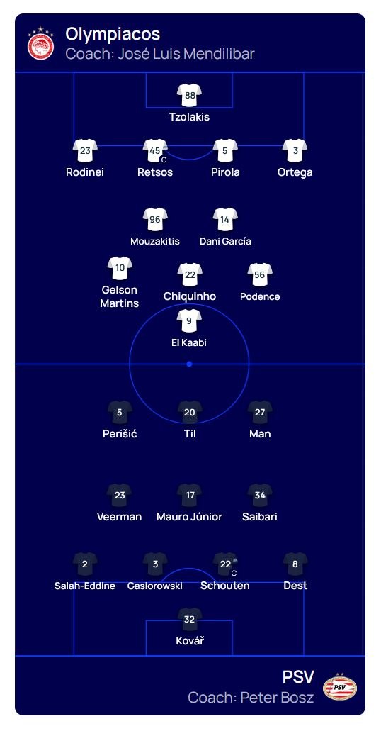 Στο παιχνίδι με την ολλανδική ομάδ,α ο Χοσέ Λουίς Μεντιλίμπαρ ξεκινάει τον Ολυμπιακό με τον Τζολάκη μπροστά από την εστία και τους Ροντινέι, Ρέτσο, Πιρόλα και Ορτέγκα στην τετράδα της άμυνας. Οι Γκαρθία και Μουζακίτης θα είναι στα χαφ, με τους Ποντένσε, Μαρτίνς και Τσικίνιο στην τριάδα πίσω από τον Ελ Κααμπί.