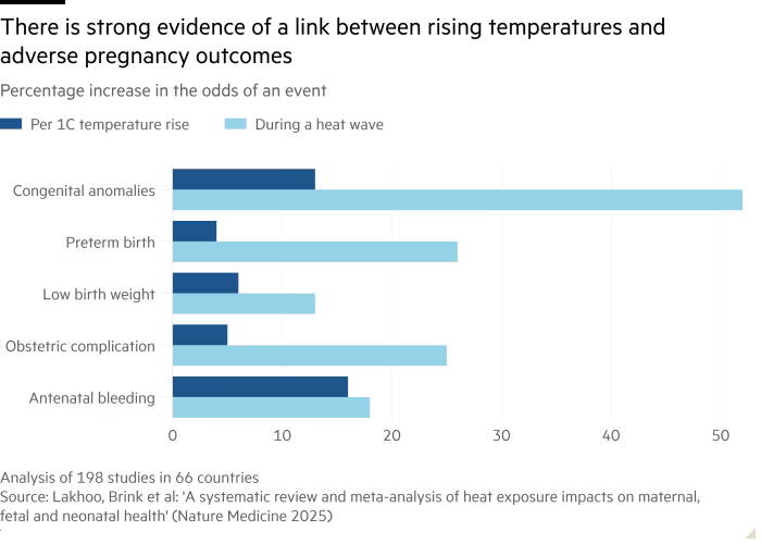 Μια σημαντική ανάλυση 198 μελετών που καλύπτουν 66 χώρες με υψηλό εισόδημα, η οποία δημοσιεύθηκε στο περιοδικό Nature το 2024, διαπίστωσε ότι για κάθε αύξηση της έκθεσης στη ζέστη κατά 1 °C, οι πιθανότητες πρόωρου τοκετού αυξάνονται κατά 4%.