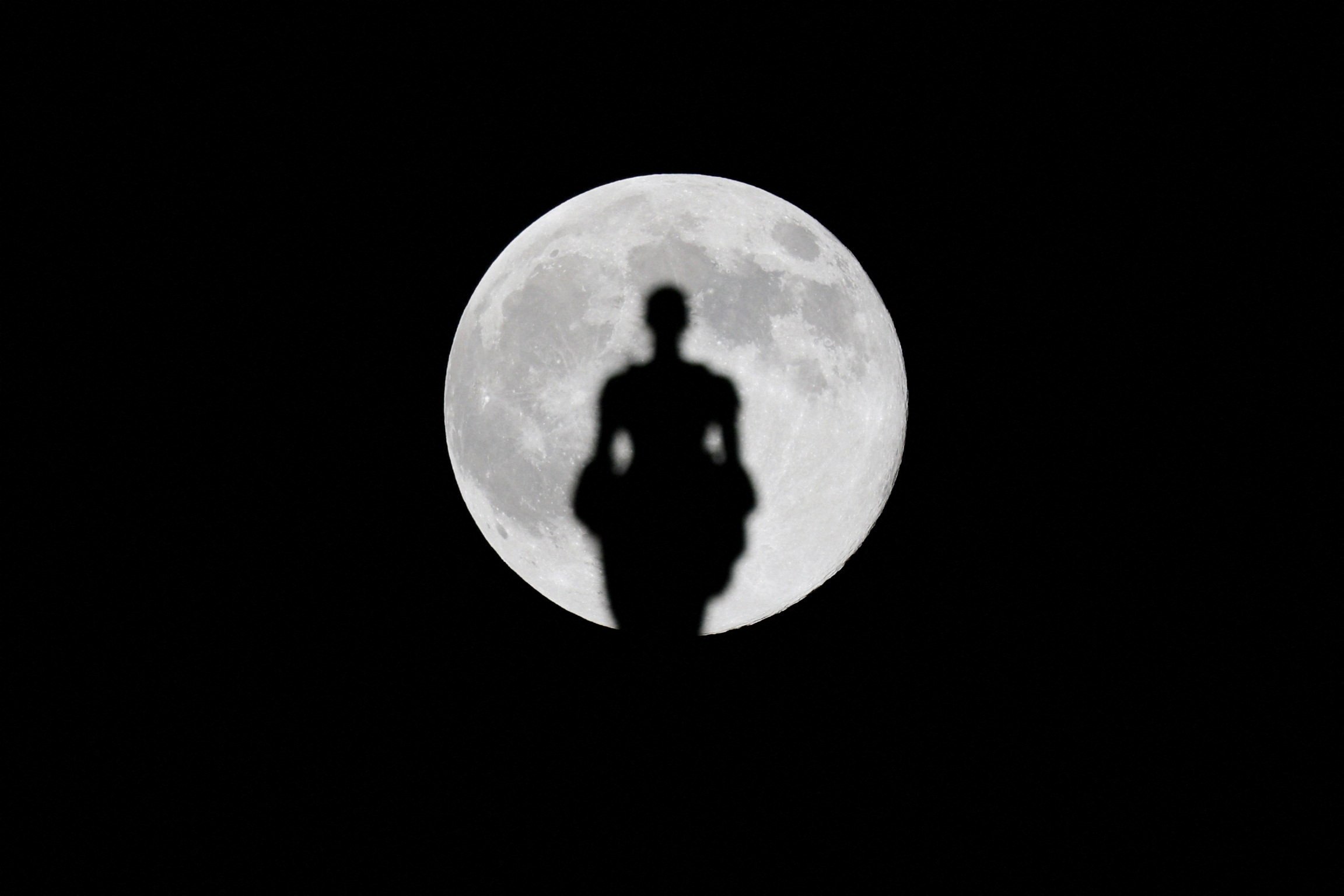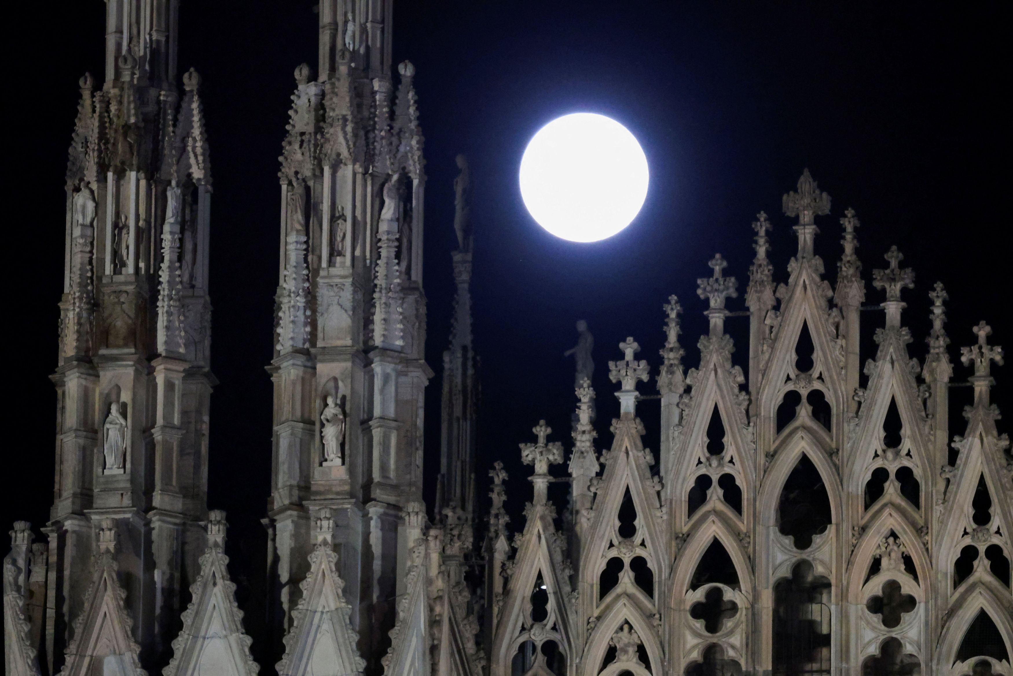 Ένα υπερ-φεγγάρι ανατέλλει πίσω από ένα άγαλμα του καθεδρικού ναού Duomo στο Μιλάνο της Ιταλίας.