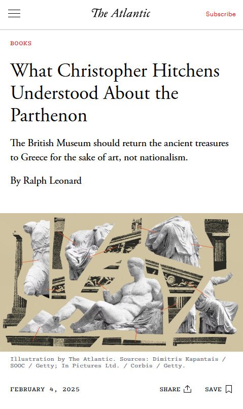 «Υπάρχει ακόμα χρόνος για να γίνει η πράξη της επιστροφής: όχι εκβιαστικά, με πιέσεις ή καταγγελίες, αλλά προσφερόμενη ελεύθερα, ως φόρος τιμής στο αδιαίρετο της Τέχνης και –γιατί να μην το πούμε χωρίς αμηχανία;– της Δικαιοσύνης» είχε υπερασπιστεί ο Χίτσενς -και σίγουρα είχε δίκιο.
