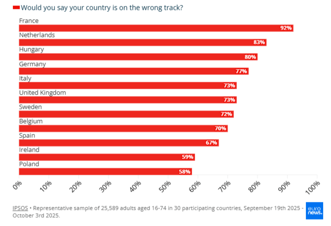 Ο διαδεδομένος πεσιμισμός είναι εμφανής και σε όλες τις ευρωπαϊκές χώρες που συμμετείχαν στην έρευνα, συμπεριλαμβανομένων της Ολλανδίας (83%), της Ουγγαρίας (80%), της Γερμανίας (77%), της Ιταλίας (73%), του Ηνωμένου Βασιλείου (73%) και της Σουηδίας (72%), πράγμα που σημαίνει ότι η συντριπτική πλειοψηφία πιστεύει ότι η χώρα βρίσκεται σε λάθος δρόμο.