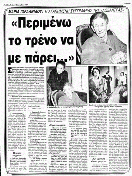 *Άρθρο που έφερε τον τίτλο «Περιμένω το τρένο να με πάρει…» και είχε δημοσιευτεί στην εφημερίδα «Τα Νέα» την Τετάρτη 30 Δεκεμβρίου 1987. Η Μαρία Ιορδανίδου είχε παραχωρήσει την ανωτέρω συνέντευξη στη Χ. Σταματέλου.