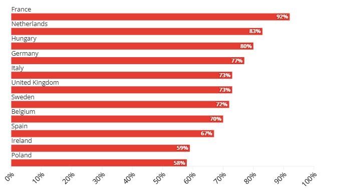 Η εκτεταμένη απαισιοδοξία είναι επίσης εμφανής σε όλες τις ευρωπαϊκές χώρες που συμμετείχαν στην έρευνα, συμπεριλαμβανομένων των Κάτω Χωρών (83%), Ουγγαρίας (80%), Γερμανίας (77%), Ιταλίας (73%), Ηνωμένου Βασιλείου (73%) και Σουηδίας (72%), που σημαίνει ότι η συντριπτική πλειοψηφία πιστεύει ότι η χώρα βρίσκεται σε λάθος δρόμο.