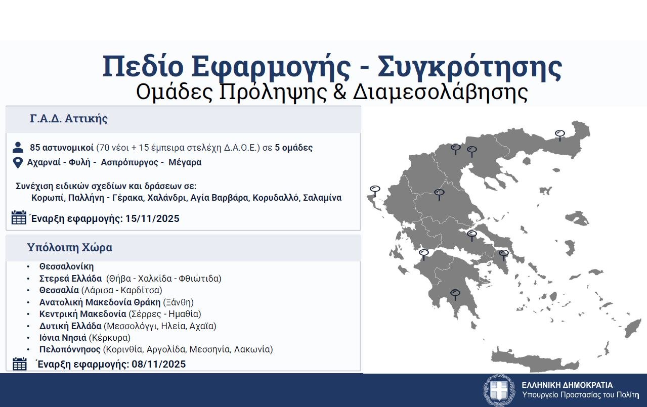 Η νέα Ομάδα Πρόληψης και Διαμεσολάβησης θα αναλάβει δράση σε 25 περιοχές και 152 σημεία σε όλη τη χώρα και θα περιλαμβάνει 24ωρη ένστολη παρουσία, ελέγχους στα σπίτια με στοχευμένες επιχειρήσεις.