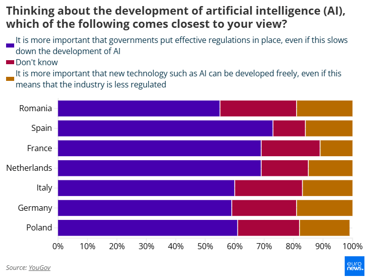 Η έρευνα, που διεξήχθη σε επτά χώρες της ΕΕ —Γαλλία, Γερμανία, Ιταλία, Κάτω Χώρες, Πολωνία, Ρουμανία και Ισπανία— δείχνει ότι η πλειονότητα των ερωτηθέντων θεωρεί την αποτελεσματική ρύθμιση της τεχνητής νοημοσύνης ως κορυφαία προτεραιότητα.