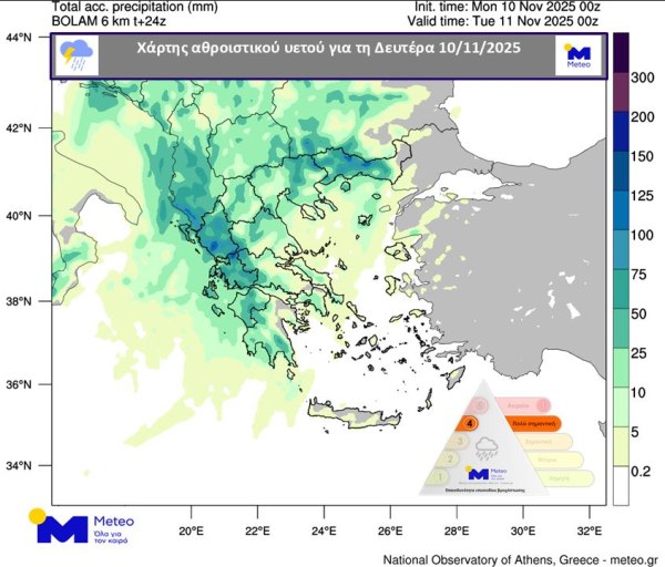 – Σύμφωνα με την κατηγοριοποίηση του επεισοδίου βροχόπτωσης (Regional Precipitation Index – RPI), η οποία εφαρμόζεται από τη μονάδα ΜΕΤΕΟ του Εθνικού Αστεροσκοπείου Αθηνών, το αναμενόμενο επεισόδιο βροχόπτωσης κατά τη διάρκεια της Δευτέρας 10/11 κατατάσσεται στην Κατηγορία 4 (Πολύ σημαντική).