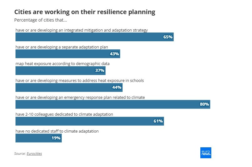 Η έρευνα της Eurocities ανέλυσε πόλεις σε 17 ευρωπαϊκές χώρες, μεταξύ των οποίων η Πορτογαλία, η Ιταλία, η Γερμανία, η Ισπανία και η Γαλλία. Σύμφωνα με τα ευρήματα, σε ποσοστό 80% οι πόλεις έχουν αναπτύξει ή αναπτύσσουν σχέδιο έκτακτης ανάγκης για ζητήματα που σχετίζονται με το κλίμα.