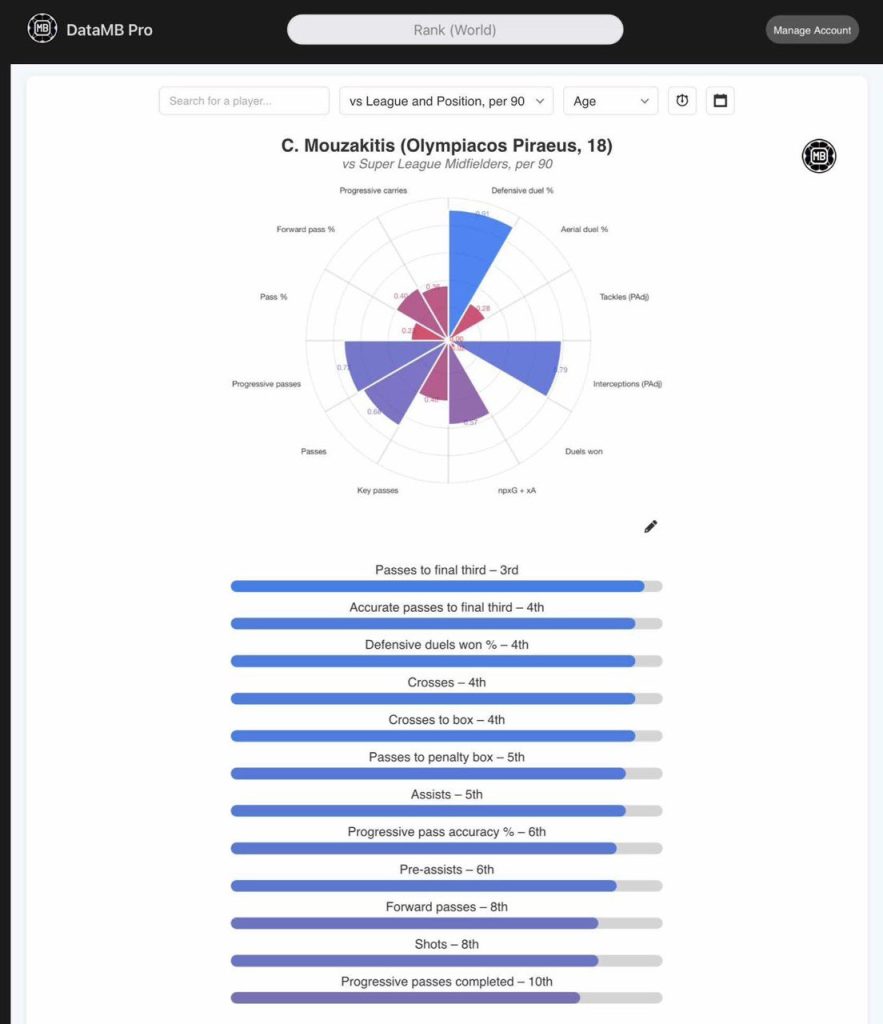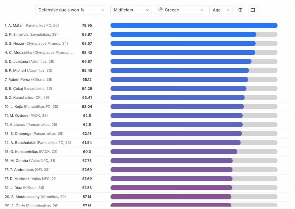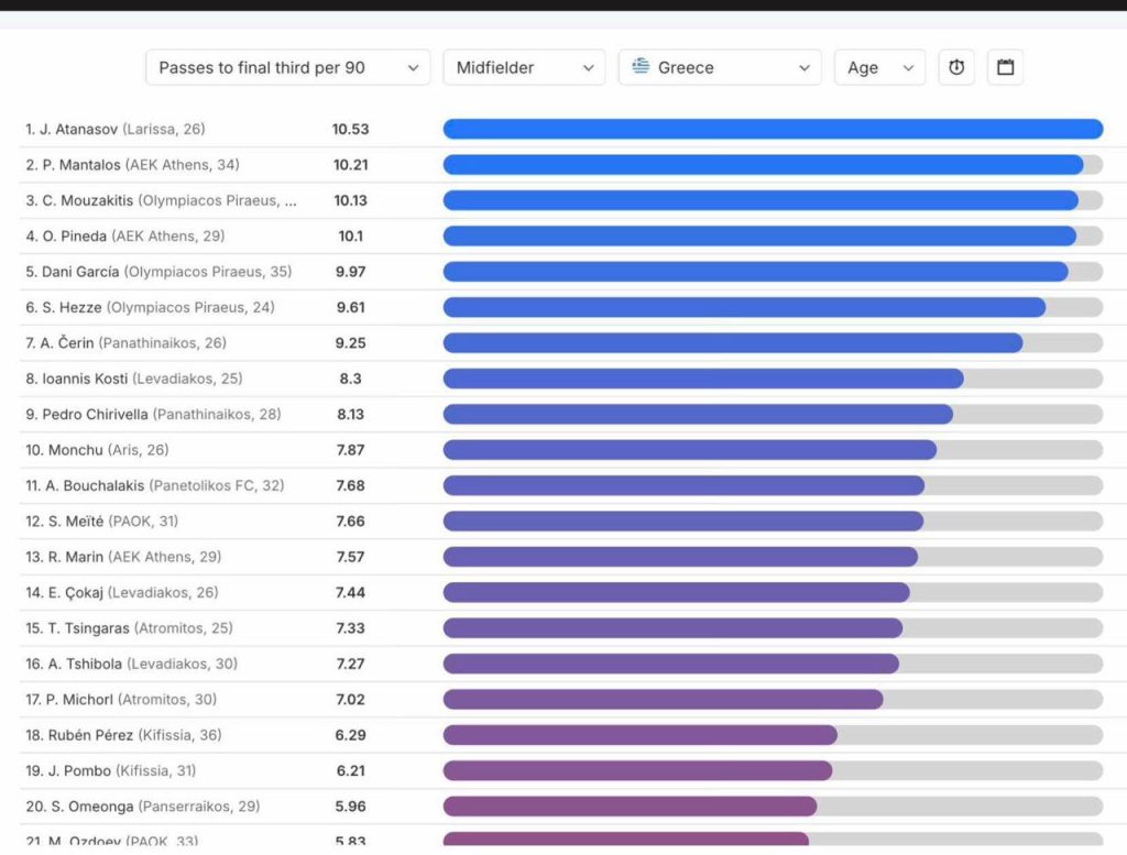 He’s Olympiacos’ best passer in vertical play, and the third most accurate passer in the Greek Super League in passes within the final third of the field and, at the same time, fourth in defensive duels won.