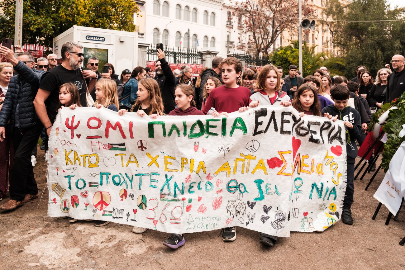 Η αλληλεγγύη στον παλαιστινιακό λαό κυριαρχεί στα συνθήματα, στις αφίσες αλλά και τις εκδηλώσεις που έγιναν στο Πολυτεχνείο ενώ το μήνυμα για ελεύθερη Παλαιστίνη θα είναι κυρίαρχο και στην πορεία.