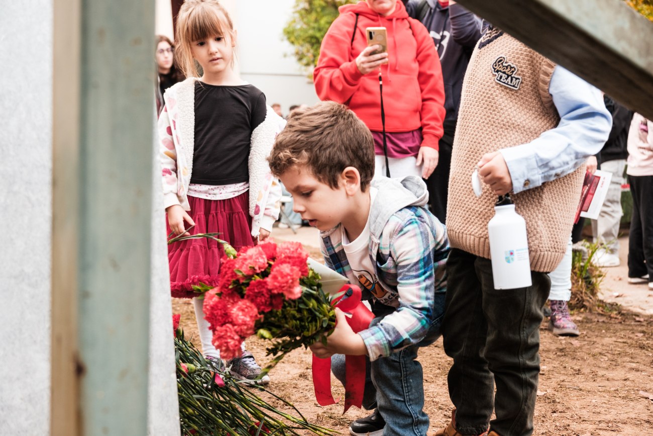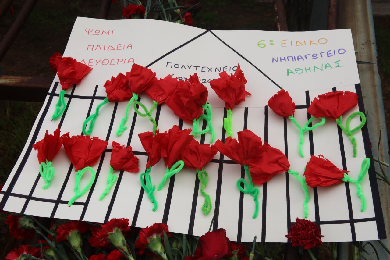 Αντιπροσωπείες σχολείων φτάνουν επίσης στο Πολυτεχνείο με μαθητές να έχουν φτιάξει τις δικές τους αφιερώσεις για να τιμήσουν το μήνυμα της εξέγερσης.