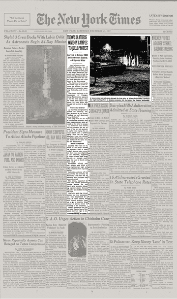Η ανταπόκριση των New York Times (17.11.1973) είναι από τις πρώτες που περιγράφουν συγκροτημένα τη νύχτα της εισβολής. Σε μια φράση-εικόνα που θα γίνει εμβληματική, σημειώνει ότι «Έλληνες στρατιώτες, χρησιμοποιώντας ένα άρμα μάχης, έριξαν τις σιδερένιες πύλες» του Πολυτεχνείου, για να βοηθήσουν την αστυνομία να απομακρύνει περίπου 2.000 φοιτητές.
