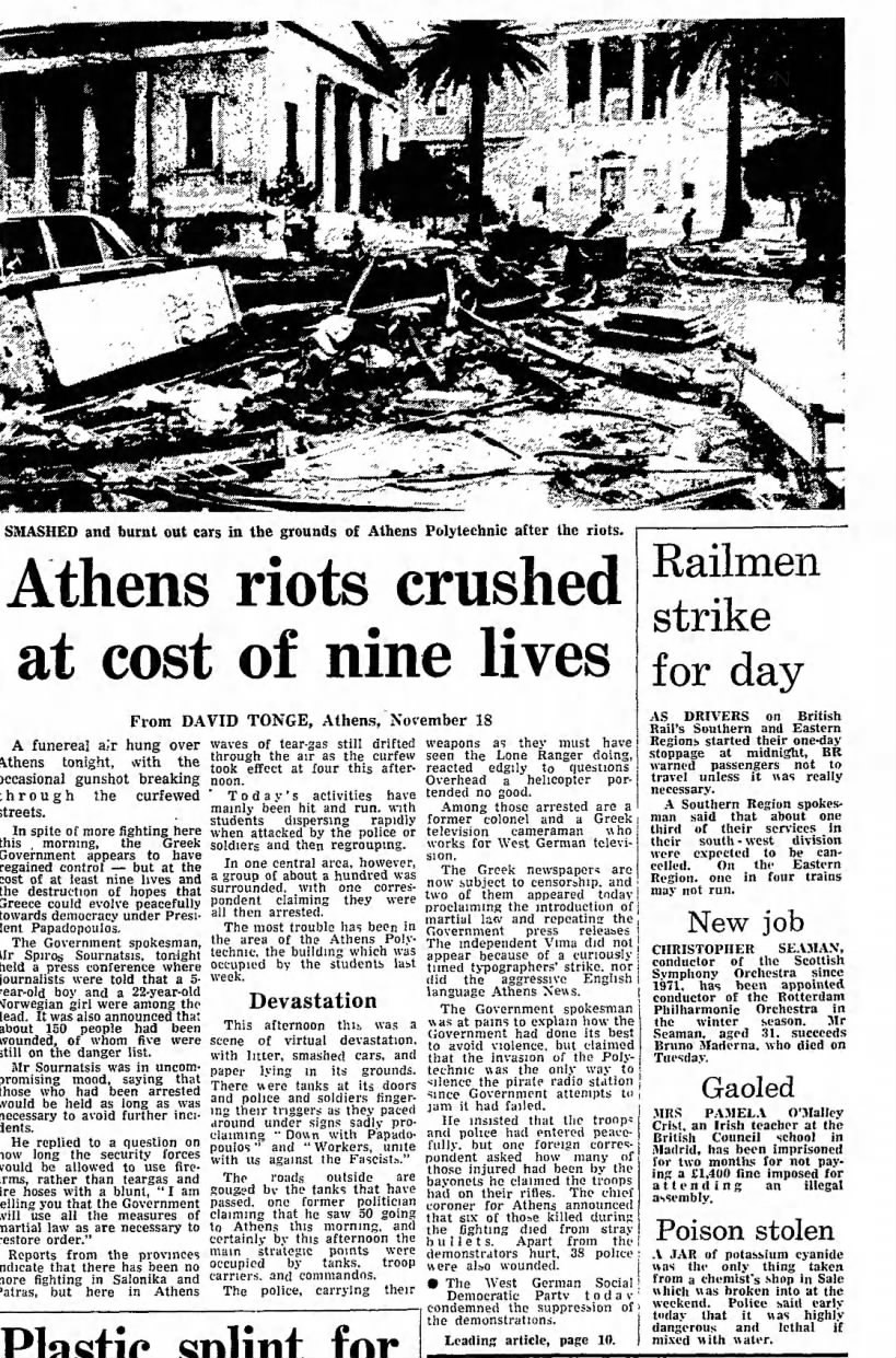 Η βρετανική εφημερίδα Guardian, μόλις μία μέρα μετά την καταστολή, περιγράφει μια πόλη παγωμένη από τον φόβο και τις απώλειες. Σημειώνει ότι πάνω από την Αθήνα είχε απλωθεί «μια ατμόσφαιρα πένθους ήταν απλωμένη πάνω από την Αθήνα» (The Guardian, 18.11.1973), ενώ οι πυροβολισμοί έσπαγαν τη σιωπή της απαγόρευσης κυκλοφορίας.