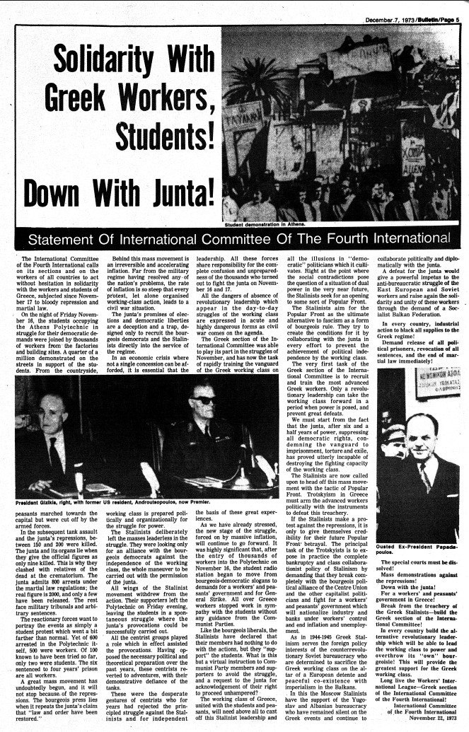 Την πιο ριζοσπαστική ανάγνωση των γεγονότων προσφέρει η προκήρυξη της Διεθνούς Επιτροπής της Τέταρτης Διεθνούς (Bulletin, 7.12.1973). Το κείμενο δεν ενδιαφέρεται τόσο για τις λεπτομέρειες της νύχτας της εισβολής, όσο για τη συνολική ταξική διάσταση. Απευθυνόμενο «στους εργάτες όλων των χωρών», καλεί σε δράση «σε αλληλεγγύη με τους εξεγερμένους Έλληνες φοιτητές και εργάτες» που, όπως σημειώνει, «έχουν υποστεί αιματηρή καταστολή και στρατιωτικό νόμο» (Bulletin, 7.12.1973).