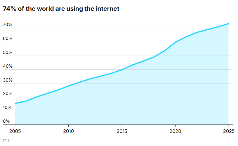 Μια πρόσφατη έκθεση δείχνει ότι περίπου έξι δισεκατομμύρια άνθρωποι είναι τώρα συνδεδεμένοι στο διαδίκτυο, μια αύξηση 200 εκατομμυρίων από τα 5,8 δισεκατομμύρια χρήστες το 2024.