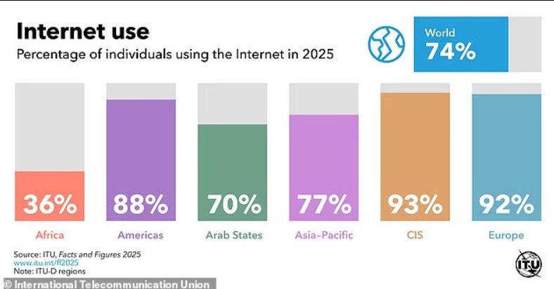 Παρά την αύξηση αυτή, 2,2 δισεκατομμύρια άνθρωποι παραμένουν εντελώς εκτός διαδικτύου, υπογραμμίζοντας ένα επίμονο παγκόσμιο χάσμα συνδεσιμότητας, σύμφωνα με την Daily Mail.