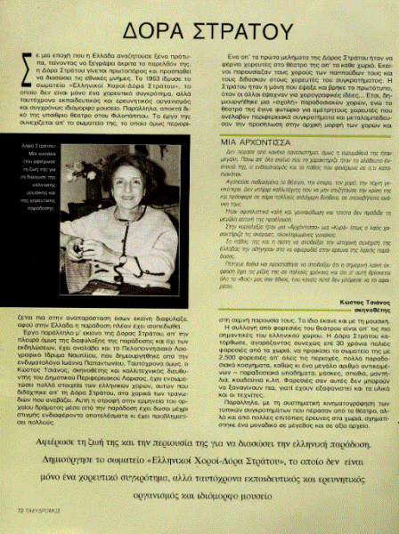 Στο τεύχος του «Ταχυδρόμου» που είχε κυκλοφορήσει στις 21 Οκτωβρίου 1992 ο διακεκριμένος θεατράνθρωπος (σκηνοθέτης, ηθοποιός), χορογράφος και συγγραφέας Κώστας Τσιάνος έγραφε για τη Δόρα Στράτου τα εξής: