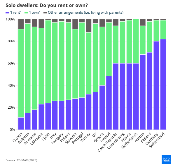 Τα ποσοστά ιδιοκτησίας κατοικιών μεταξύ των ατόμων που ζουν μόνοι είναι σημαντικά χαμηλά στην Ελβετία (17%), τη Γερμανία (19%) και τη Μάλτα (15%).