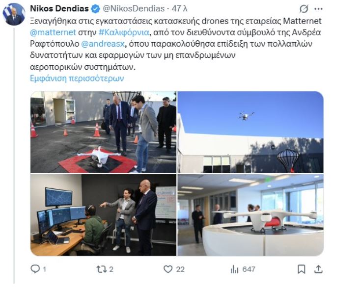 Με ανάρτηση στο κοινωνικό δίκτυο Χ ο κ. Δένδιας αναφέρει: «Ξεναγήθηκα στις εγκαταστάσεις κατασκευής drones της εταιρείας Matternet στην Καλιφόρνια, από τον διευθύνοντα σύμβουλο της εταιρείας Ανδρέα Ραφτόπουλο όπου παρακολούθησα επίδειξη των πολλαπλών δυνατοτήτων και εφαρμογών των μη επανδρωμένων αεροπορικών συστημάτων».