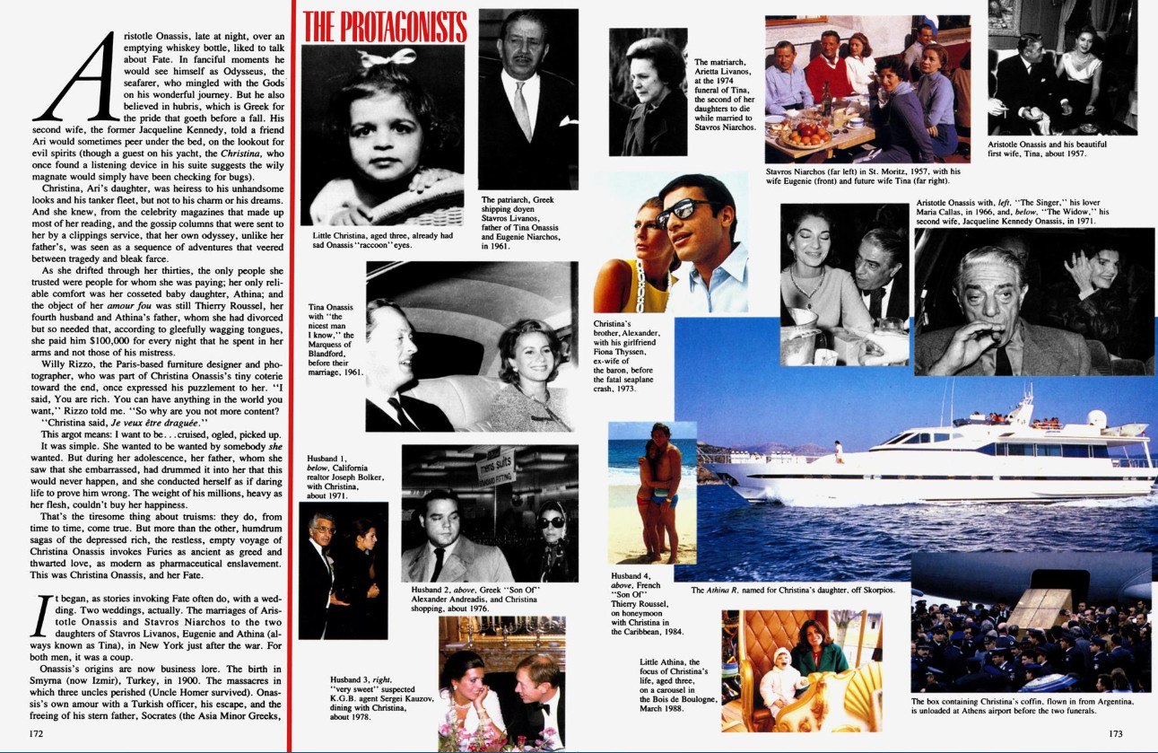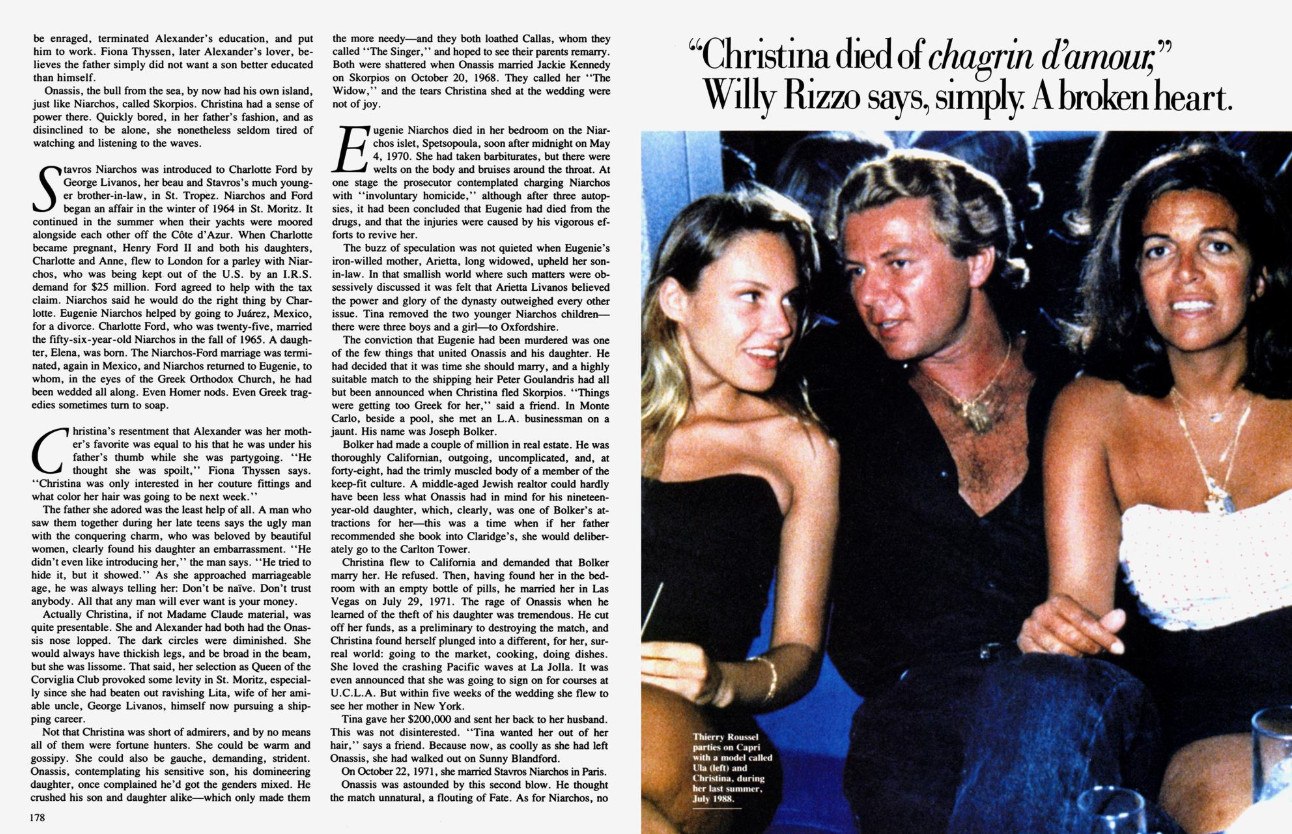 Το ανήσυχο, άτυχο ταξίδι της Χριστίνας Ωνάση τελείωσε, αλλά η ιστορία, φυσικά, συνεχίστηκε. Ο Τζόζεφ Μπόλκερ πέθανε από λευχαιμία. Ο Αλέξανδρος Ανδρεάδης ξαναπαντρεύτηκε. Ο Σεργκέι Καούζοφ ζει στο Λονδίνο, δίπλα στο Harrods, απολαμβάνοντας τη ζωή ενός πολυεκατομμυριούχου στην παρέα της σαγηνευτικής εικοσιεπτάχρονης κόρης ενός μεγιστάνα γαλακτοκομικών προϊόντων της Μασαχουσέτης. Ο Σταύρος Νιάρχος, ο οποίος φέρεται να είπε σε δείπνο στη Νέα Υόρκη ότι «δεν εξεπλάγη» από τον θάνατο της Χριστίνας, εξακολουθεί να είναι ευπρόσδεκτος καλεσμένος του διπλού κουνιάδου του, Τζορτζ Λιβανού. Και η μικρή Αθηνά Ρουσέλ κληρονομεί μια περιουσία που εκτιμάται στο μισό δισεκατομμύριο δολάρια.