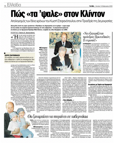 Δέκα μόλις λεπτά της ώρας χρειάστηκε ο Πρόεδρος της Δημοκρατίας για να γράψει —χωρίς καμία επί της ουσίας του κειμένου προσυνεννόηση με την τότε κυβέρνηση— τη συγκινητική ομιλία του στο δείπνο με τον Αμερικανό Πρόεδρο Μπιλ Κλίντον, το βράδυ της 19ης Νοεμβρίου του 1999.