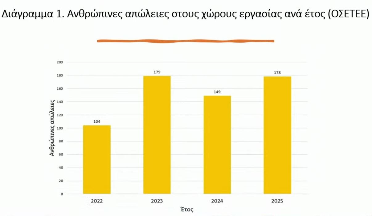 Σύμφωνα με την έρευνα για την Ασφάλεια και την Υγεία στην Εργασία, τα στοιχεία καταγράφουν μεγάλη αύξηση των ανθρώπινων απωλειών και των σοβαρά τραυματισμένων ατόμων στους χώρους εργασίας τα έτη 2023 και 2025. «Κάθε θάνατος στην εργασία είναι πλήγμα για τη Δημοκρατία, την Κοινωνία και τον Πολιτισμό μας» υπογράμμισε ο κ. Στοϊμενίδης, συμπληρώνοντας ότι «απαιτείται άμεση ανάληψη δράσης για την ανάσχεση της ανθρωπιστική κρίσης».