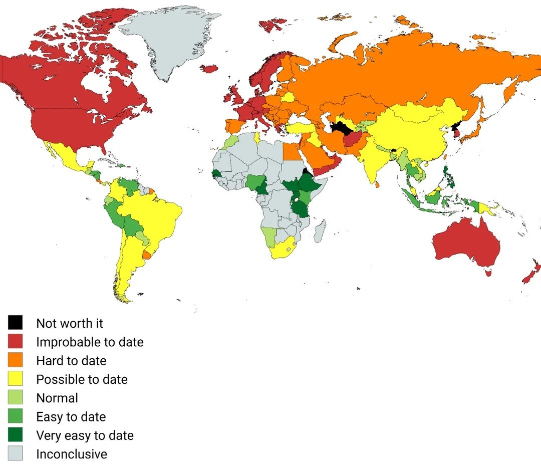 Χάρτης που δείχνει τους καλύτερους προορισμούς για εύρεση σχέσης Πηγή: reddit