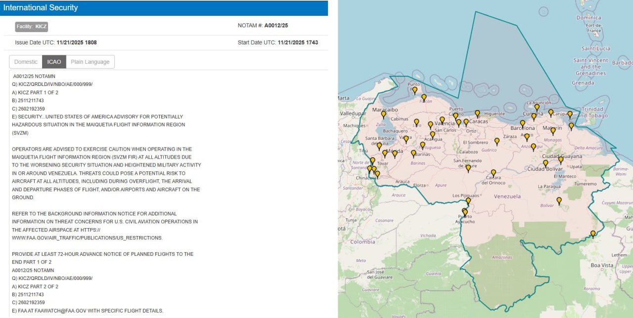 Οι ΗΠΑ εξέδωσαν νέα NOTAM σχετικά με «δυνητικά επικίνδυνη κατάσταση» κοντά στο κύριο αεροδρόμιο της Βενεζουέλας, Μαϊκιέτια, λόγω της «επιδείνωσης της κατάστασης ασφάλειας και της αυξημένης στρατιωτικής δραστηριότητας εντός ή γύρω από» τη χώρα.