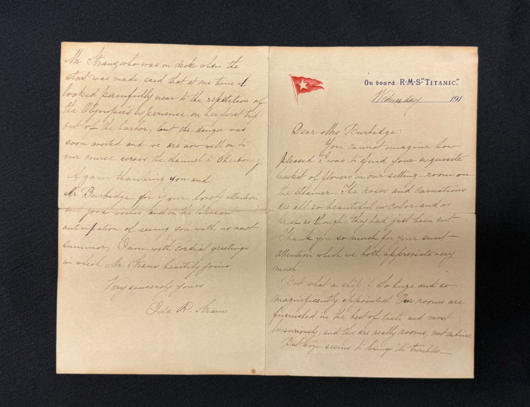 Μια επιστολή γραμμένη από την Άιντα Στράους σε επιστολόχαρτο του Τιτανικού και ταχυδρομημένη ενώ βρισκόταν στο πλοίο. Φωτογραφία: Henry Aldridge and Son Ltd/PA
