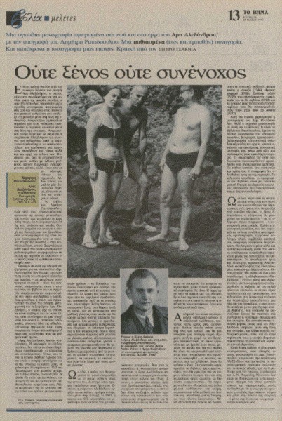 *Αποσπάσματα από κριτικό κείμενο του Σπύρου Τσακνιά (λαμιώτη ποιητή, μεταφραστή, δοκιμιογράφου και κριτικού λογοτεχνίας, 1929-1999), που έφερε τον τίτλο «Ούτε ξένος ούτε συνένοχος» και είχε δημοσιευτεί στην εφημερίδα «Το Βήμα» την Κυριακή 25 Μαΐου 1997.