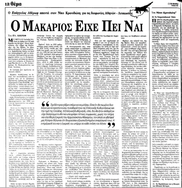 Είναι αξιοσημείωτο ότι στο φύλλο του «Βήματος» της 10ης Μαΐου 1987 είχε συμπεριληφθεί η πολύ ενδιαφέρουσα απάντηση (επιφυλασσόμεθα να την παραθέσουμε με την πρώτη ευκαιρία) του Ευάγγελου Αβέρωφ —άριστου επίσης γνώστη του Κυπριακού— στις θέσεις που είχε ήδη διατυπώσει ο Νίκος Κρανιδιώτης αναφορικά με τις διαφωνίες Αθηνών – Λευκωσίας.