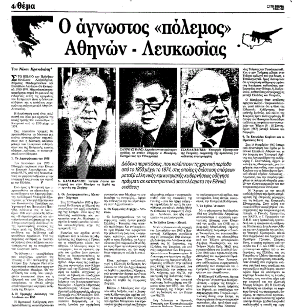 Η Αθήνα ήθελε να περιορίσει όσο μπορούσε τους εξωτερικούς περισπασμούς της και να επιδοθεί στο έργο της εσωτερικής ανασυγκρότησης. Γι’ αυτό —όπως πολύ σωστά παρατηρούν οι τρεις συγγραφείς του βιβλίου— «βιαζόταν να κλείσει την κυπριακή εκκρεμότητα, και πίεζε τον Μακάριο να κάνει προς τον σκοπό αυτόν παραχωρήσεις προς τους Τουρκοκυπρίους». Οι χειρισμοί του Υπουργείου Εξωτερικών λάμβαναν πολλές φορές σοβαρότερα υπόψη τα συμφέροντα του ελληνισμού της Πόλης και του Οικουμενικού Πατριαρχείου παρά εκείνα της Κύπρου. […]