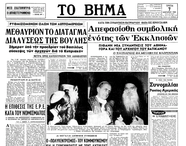 Μικρή στροφή προς τα πίσω. Την επιβάλλει η επικαιρότητα. Δεκέμβριος του 1961. Ξεφυλλίζω το σώμα του «Βήματος». Επίσκεψη στο Φανάρι της Πόλης. Προχωρημένη η νύχτα. Κλειστές οι πύλες του Πατριαρχείου. Μόνος στο γραφείο του ο Αθηναγόρας. Ώρα που οι ψυχές αισθάνονται την ανάγκη να ξεδιπλωθούν, ν’ ανοίξουν το χάρτη των ονείρων τους, να δοθούν.
