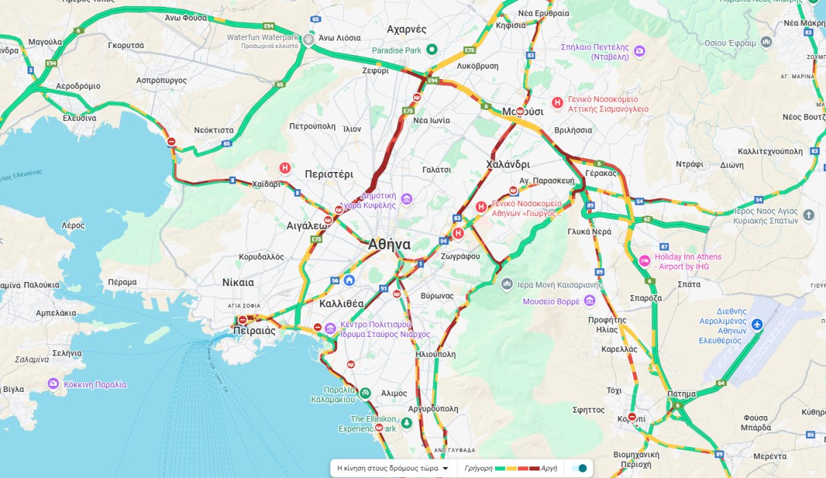 Κίνηση στους δρόμους: «Κόκκινος» ο χάρτης στην Αττική – Επιδεινώνει την κατάσταση η βροχή