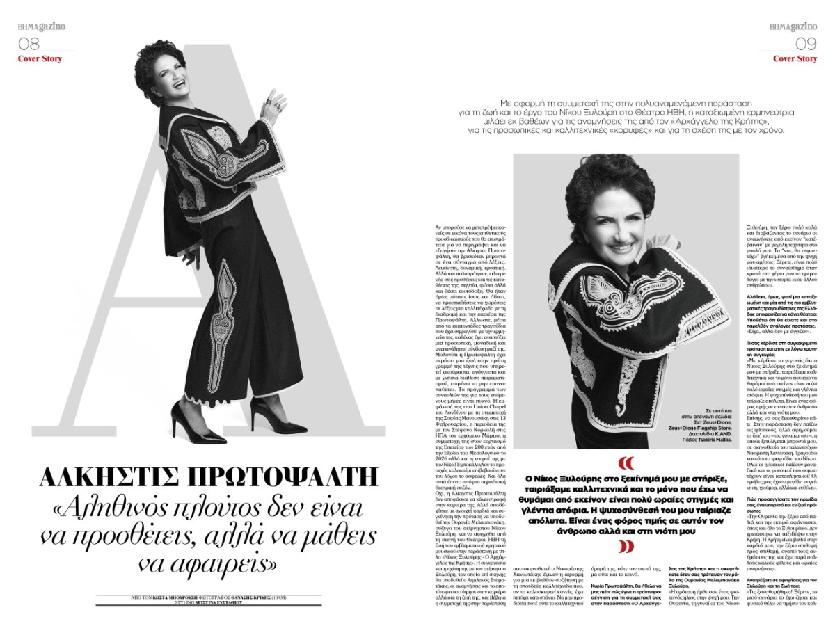 Η κορυφαία ερμηνεύτρια φωτογραφίζεται με εντυπωσιακό τρόπο για το εξώφυλλο και τις εσωτερικές σελίδες του BHMAGAZINO. Αεικίνητη, δυναμική, πολυπράγμων, με έξυπνο χιούμορ. Η Άλκηστις, μία και μοναδική, παραχωρεί μία άκρως ενδιαφέρουσα συνέντευξη με αφορμή την απόφασή της να ανέβει στη σκηνή του θεάτρου «ΗΒΗ» με σκοπό να υποδυθεί τη σύζυγο του Νίκου Ξυλούρη στην πολλά υποσχόμενη παράσταση «Νίκος Ξυλούρης – Ο Αρχάγγελος της Κρήτης». Η κ. Πρωτοψάλτη μιλάει και για πολλά άλλα θέματα και τα μελλοντικά της σχέδια τα οποία περιλαμβάνουν εκπλήξεις.