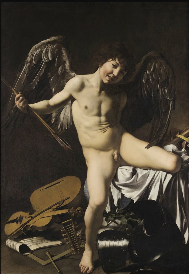 Ο Καραβάτζιο τον τοποθετεί φωτισμένο, γυμνό και άφοβο, ένα σχεδόν αληθινό αγόρι που πατά πάνω στη μουσική, την τέχνη, τα όπλα, την ίδια την κουλτούρα της εποχής του. Είναι ένα γέλιο που εισβάλλει στη μελαγχολία, θυμίζοντας επίτηδες το χάος που σκόρπιζε η «Μελαγχολία I» του Ντύρερ. Ένα έργο που προκαλεί, μπερδεύει και αποπροσανατολίζει.