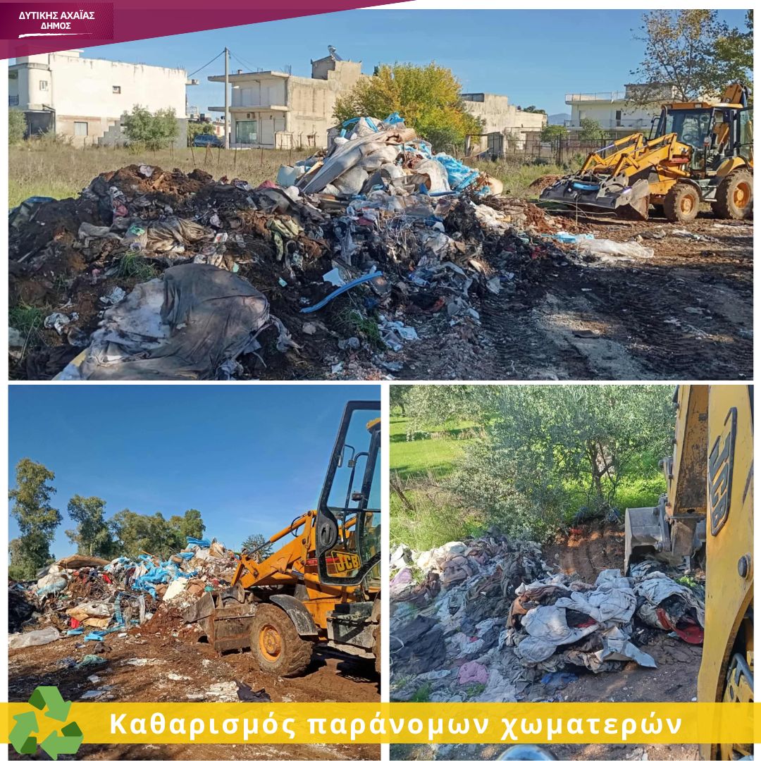 Όπως μάλιστα ενημέρωσε με σχετική της ανακοίνωση η Δημοτική Αρχή, «σε καθαρισμό αυτοσχέδιων χωματερών απομακρύνοντας δεκάδες τόνους σκουπιδιών, άχρηστων και βαρέων αντικειμένων προχώρησαν συνεργεία της αντιδημαρχίας Καθαριότητας του Δήμου Δυτικής Αχαΐας σε εκτάσεις πίσω από το Κέντρο Υγείας Κάτω Αχαΐας και πίσω από τον υδατόπυργο της Κάτω Αχαΐας».