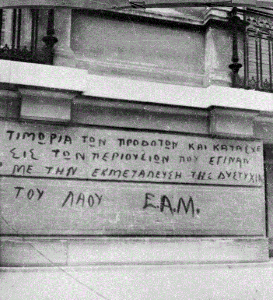 Σύνθημα του ΕΑΜ για την τιμωρία των δωσιλόγων, φθινόπωρο 1944 (πηγή: Φωτογραφικό Αρχείο Πολεμικού Μουσείου Αθηνών)