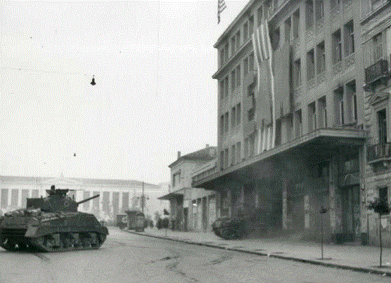 Επίθεση βρετανικών αρμάτων μάχης κατά των γραφείων του ΕΑΜ στην οδό Κοραή το Δεκέμβρη του ’44 (πηγή: Imperial War Museum)